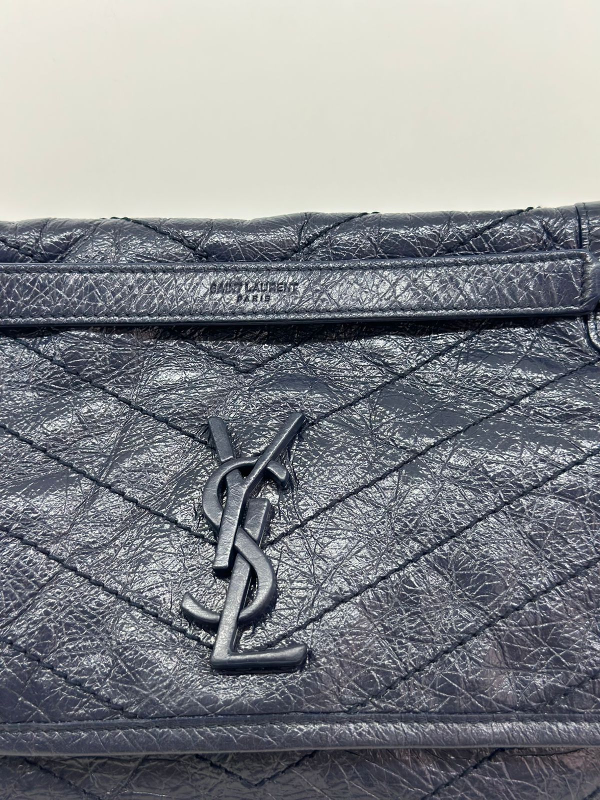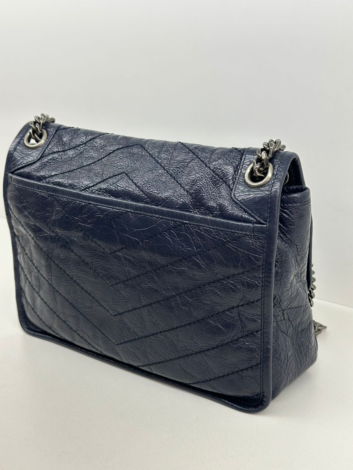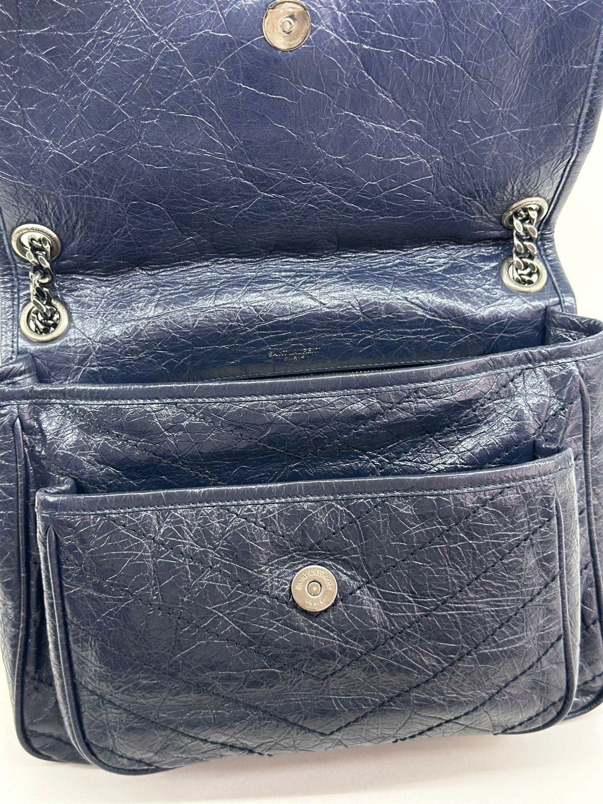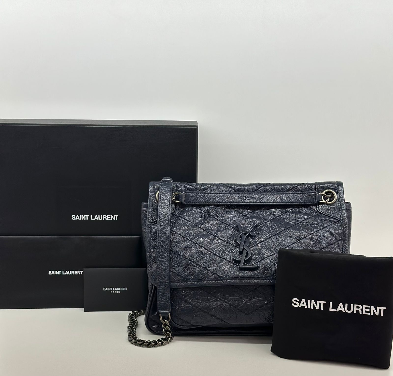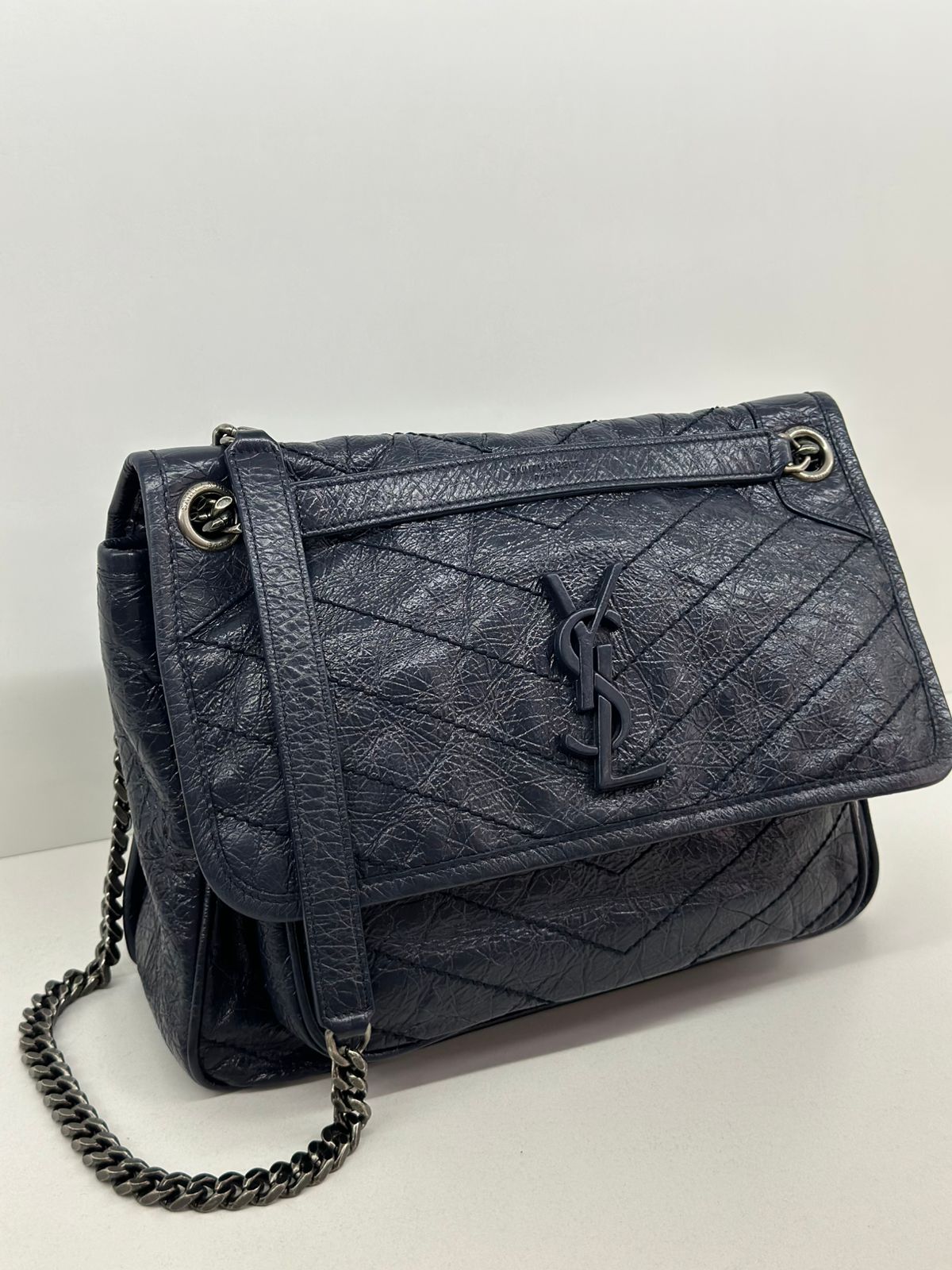 Bolsa Yves Saint Laurent Niki Média, confeccionada em couro de bezerro no matelassê preto, com ferragens no paládio escovado, possui alça em couro e corrente que pode ser usada de ombro ou transpassada, iniciais da marca na aba, fecho por aba com botão magnético, bolso na parte posterior plano, na parte frontal possui um bolso que seu fecho e pela aba flap e botão magnético, compartimento interno único com um bolso plano e um bolso com fechamento em zíper.