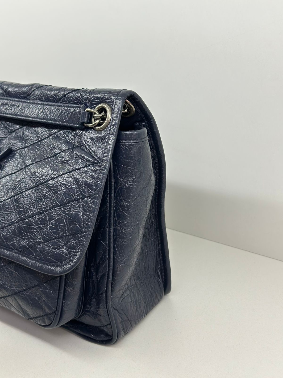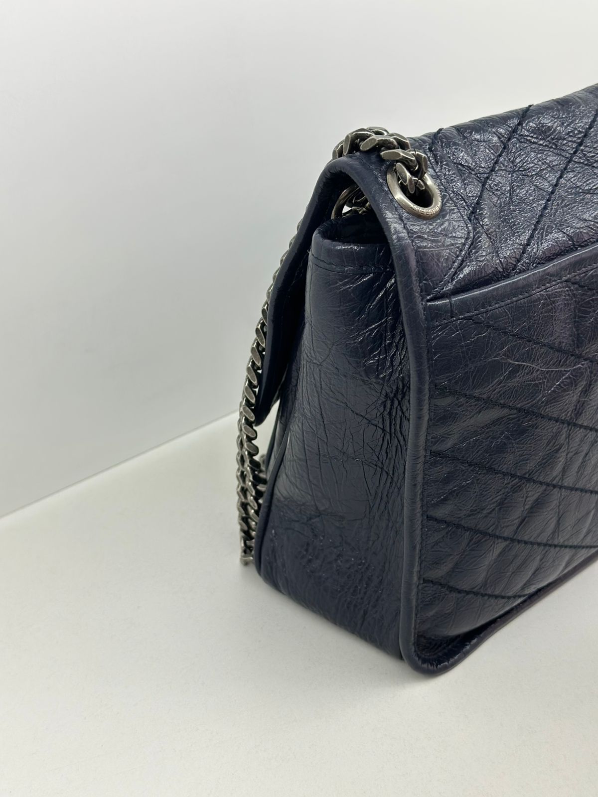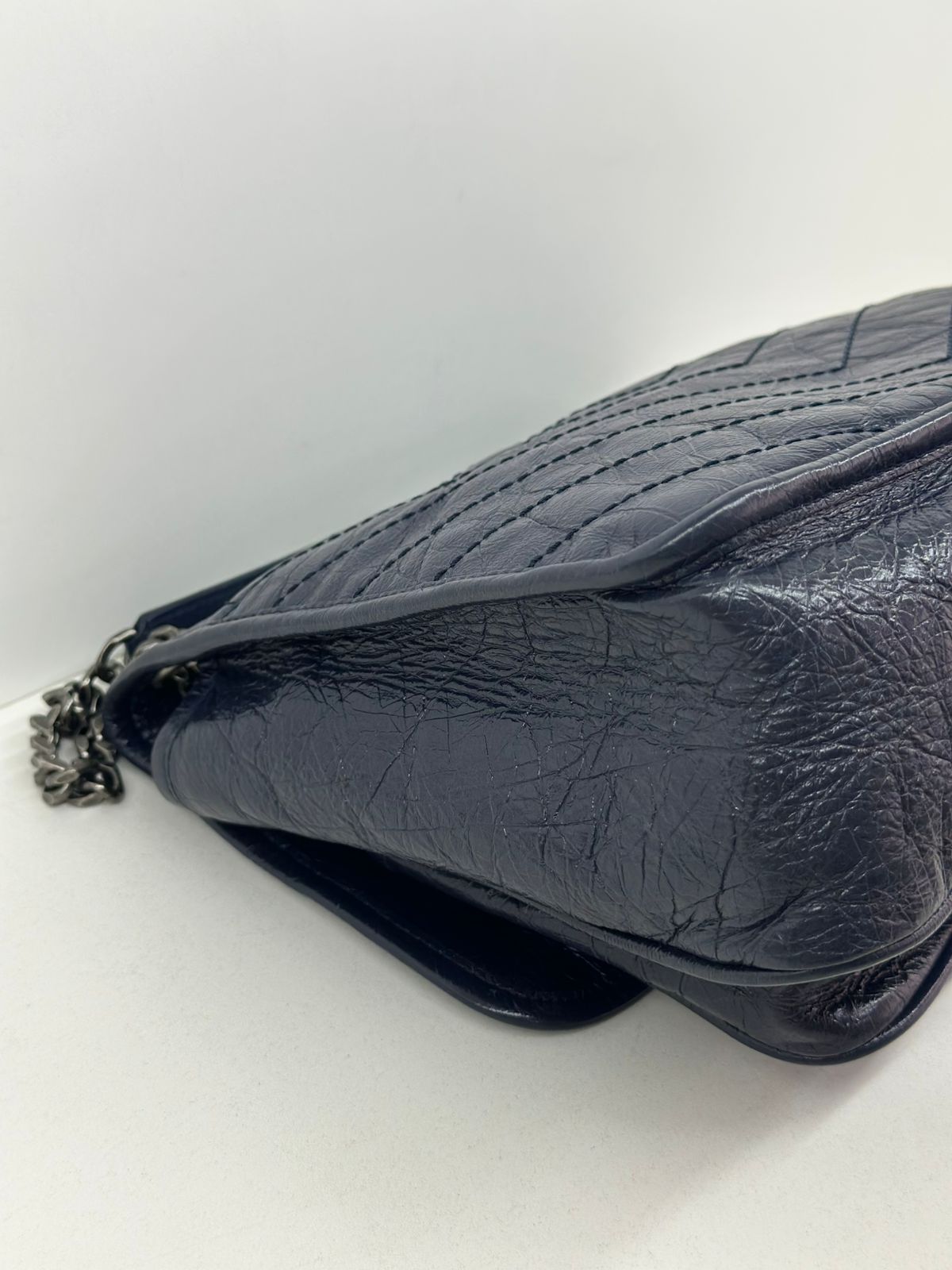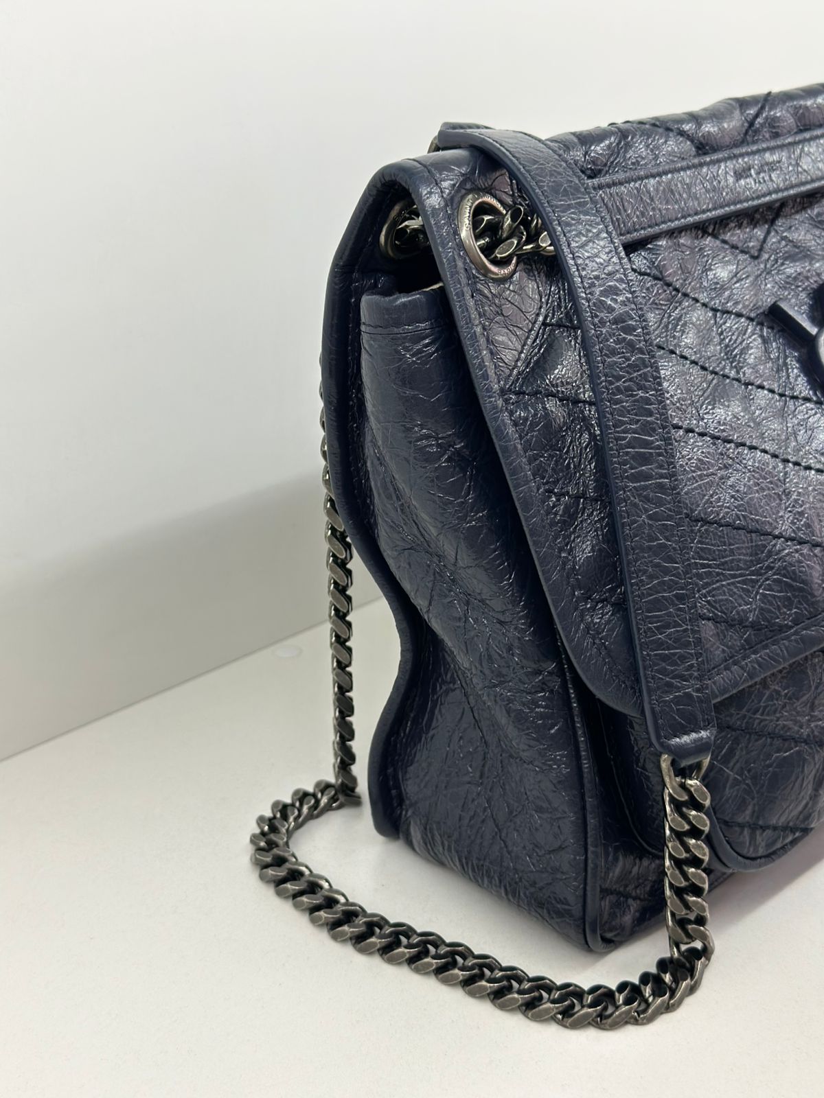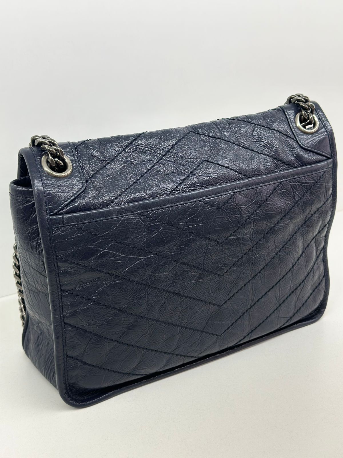 Bolsa Yves Saint Laurent Niki Média, confeccionada em couro de bezerro no matelassê preto, com ferragens no paládio escovado, possui alça em couro e corrente que pode ser usada de ombro ou transpassada, iniciais da marca na aba, fecho por aba com botão magnético, bolso na parte posterior plano, na parte frontal possui um bolso que seu fecho e pela aba flap e botão magnético, compartimento interno único com um bolso plano e um bolso com fechamento em zíper.
