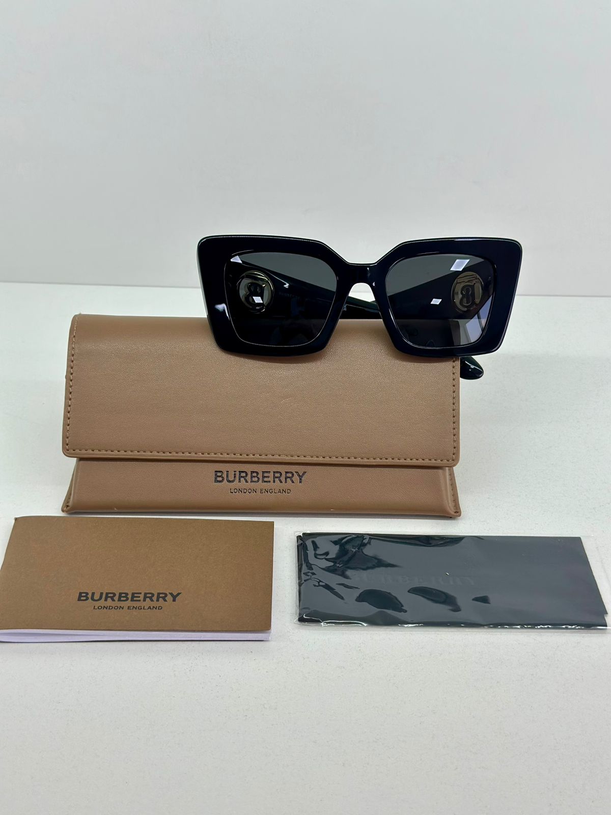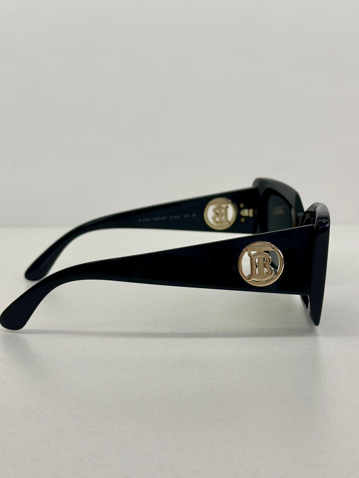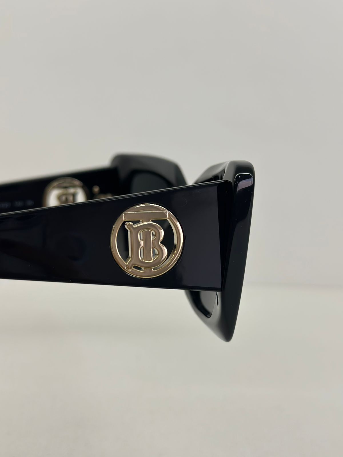 Óculos de sol Burberry Daisey, feminino, confeccionado no acetato na cor preta, hastes grossas com detalhe em metal com as iniciais da marca, armação quadrada com base arredondada e lentes pretas. Versão modernas dos anos 60, um óculos que traz feminilidade, elegância.
