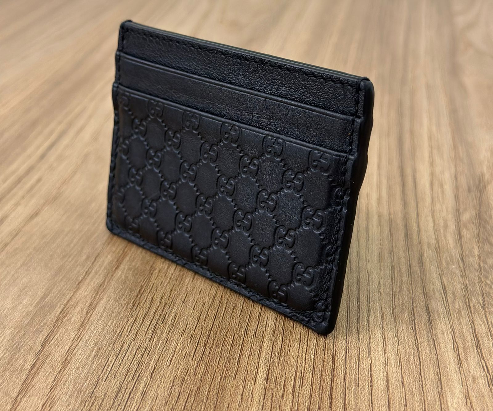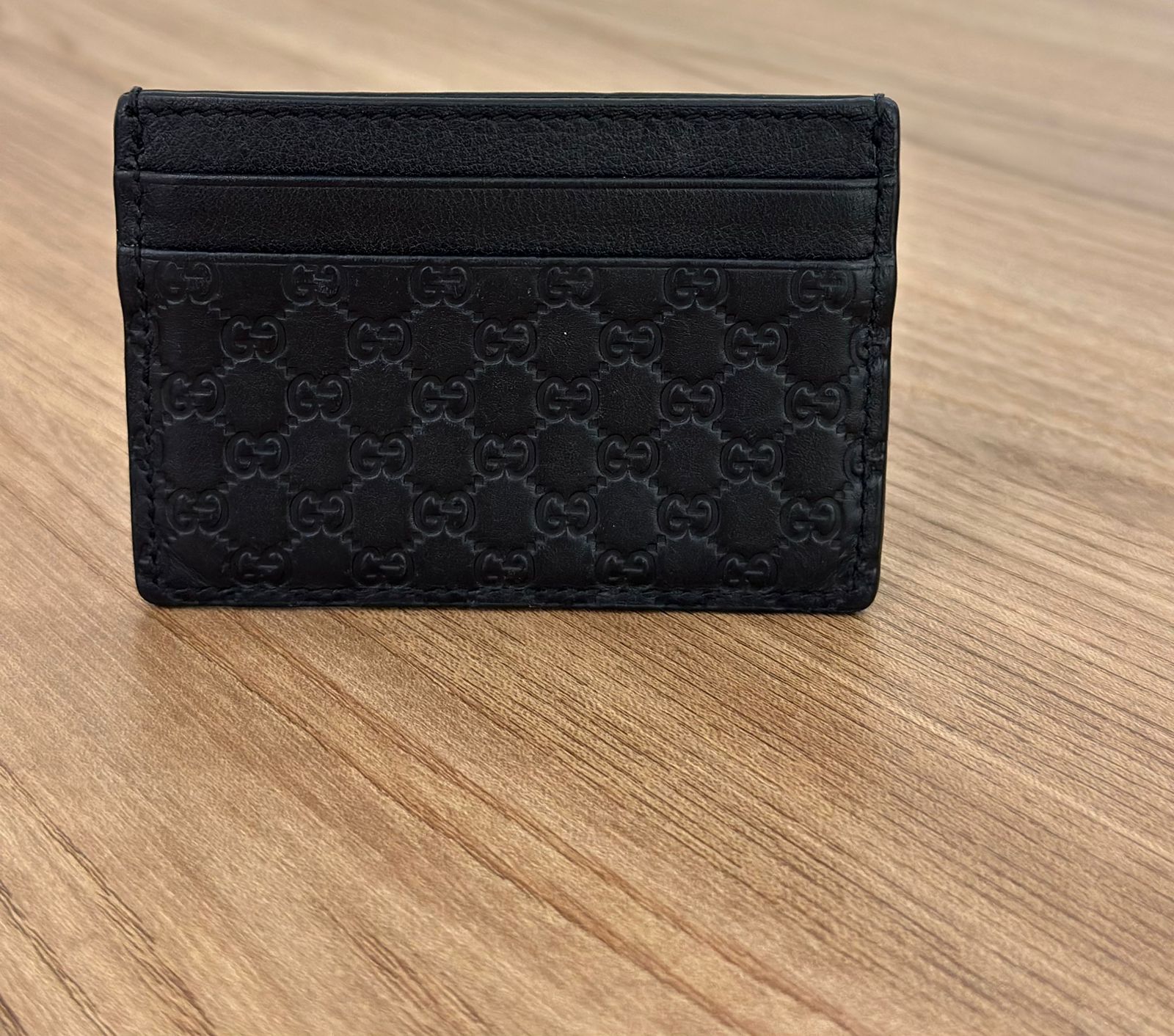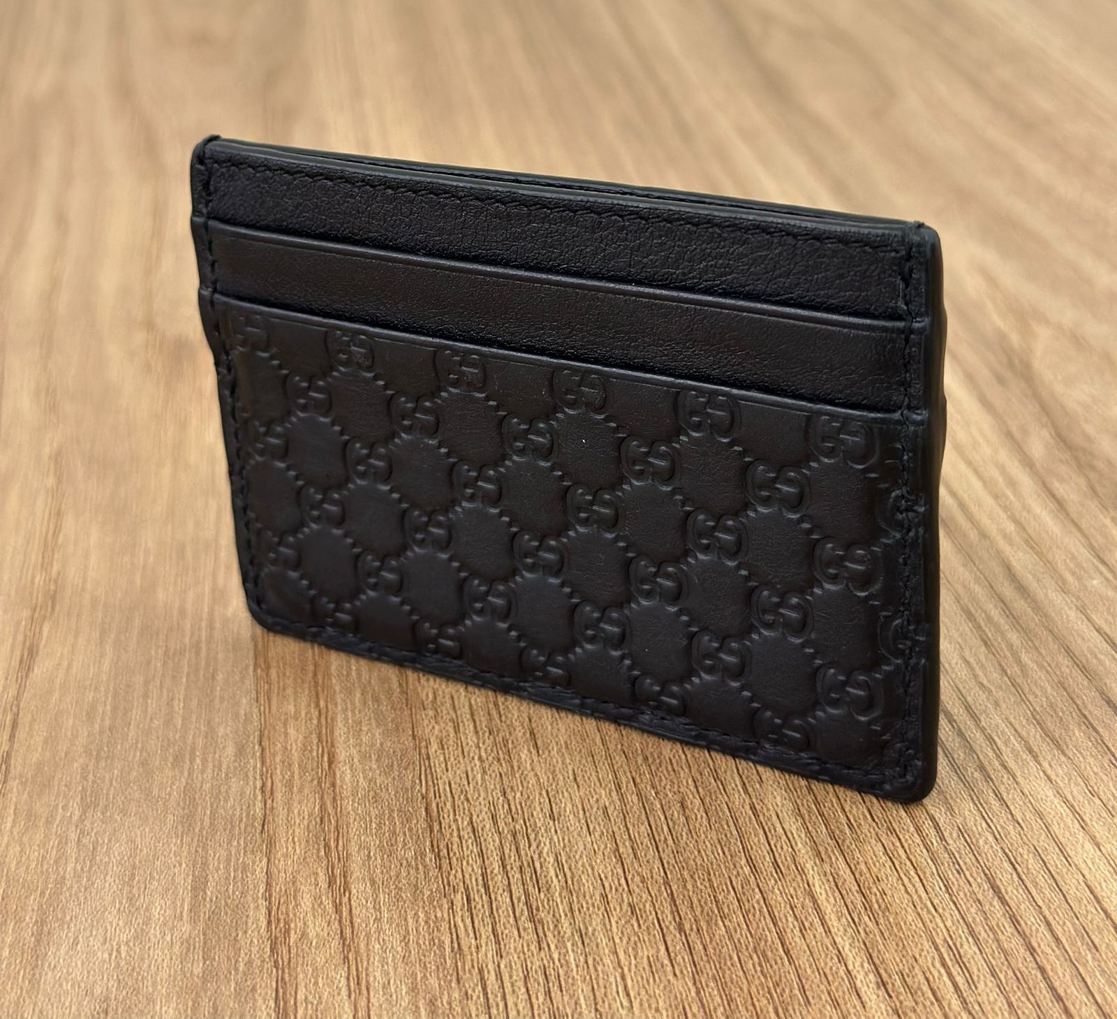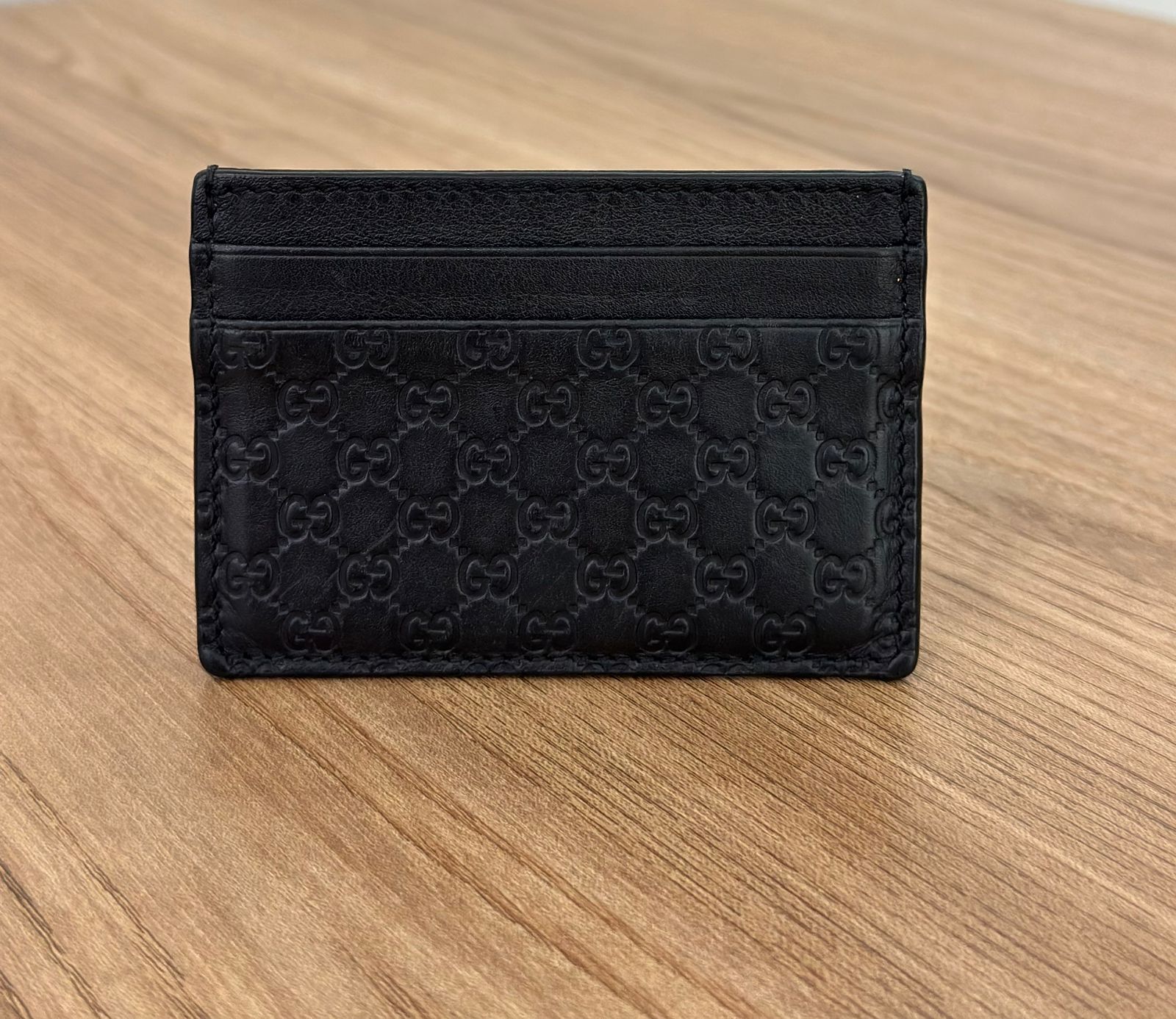 Porta cartões Gucci Microguccissima confeccionado no couro preto, possui compartimentos para cartões, bolso plano que cabe habilitação. Um acessório, elegante e discreto que cabe em qualquer bolsa.