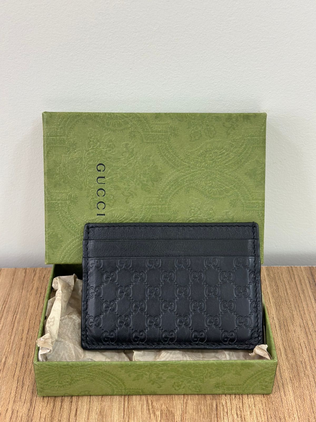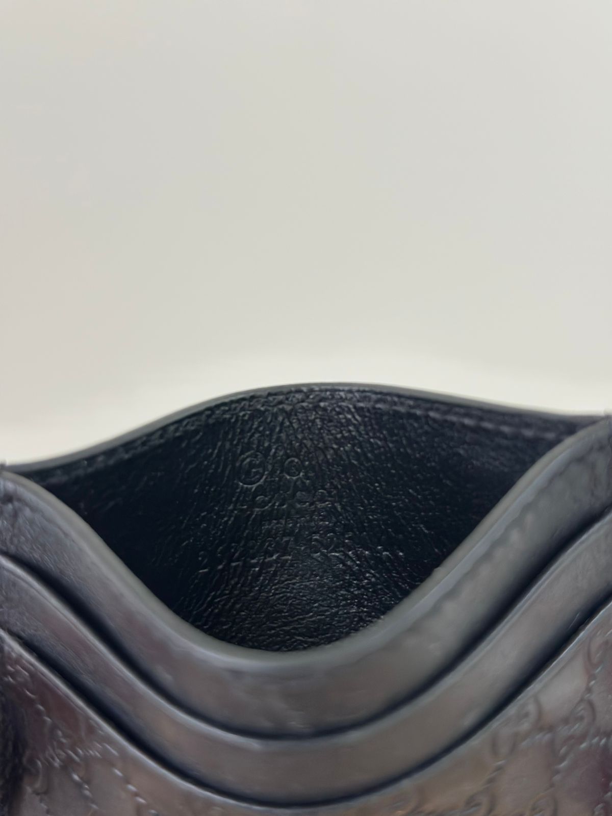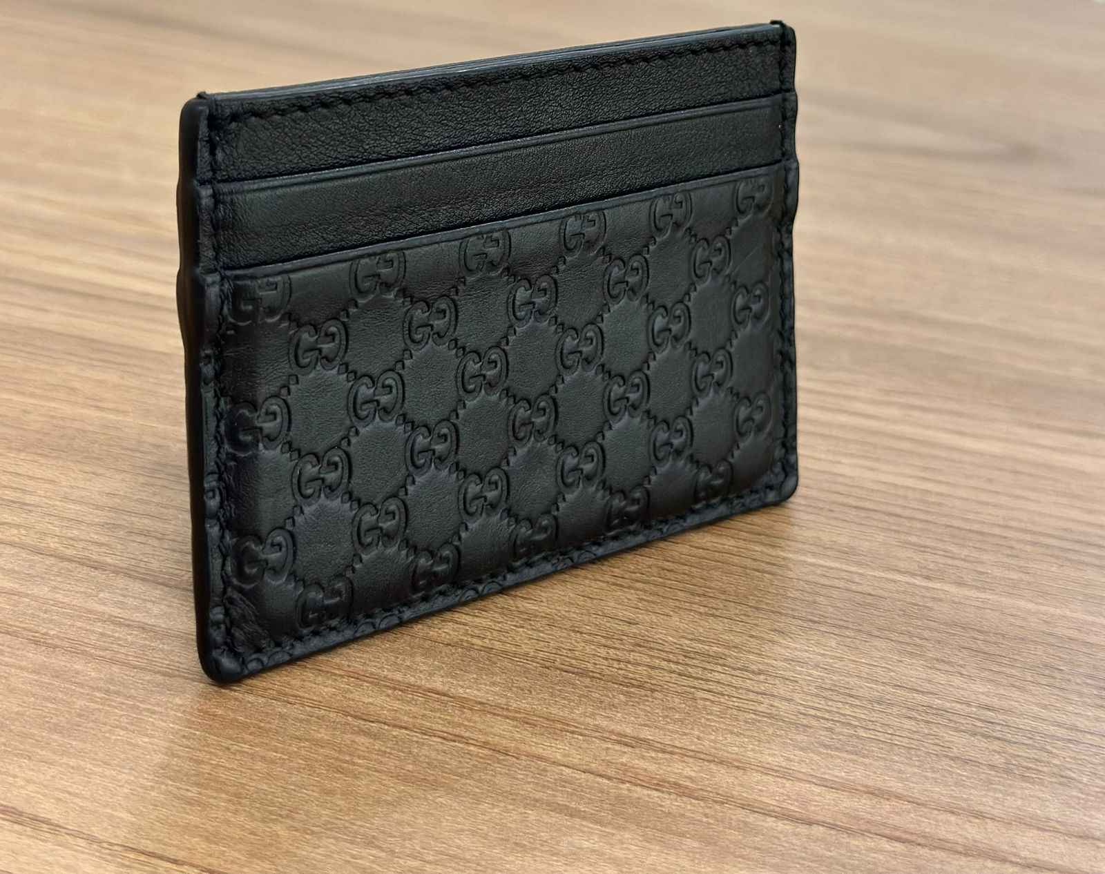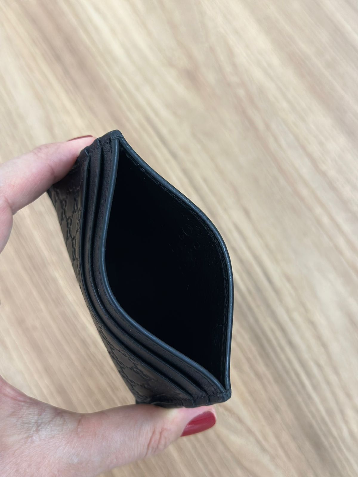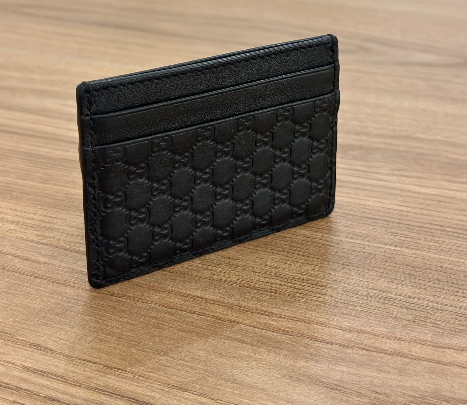 Porta cartões Gucci Microguccissima confeccionado no couro preto, possui compartimentos para cartões, bolso plano que cabe habilitação. Um acessório, elegante e discreto que cabe em qualquer bolsa.