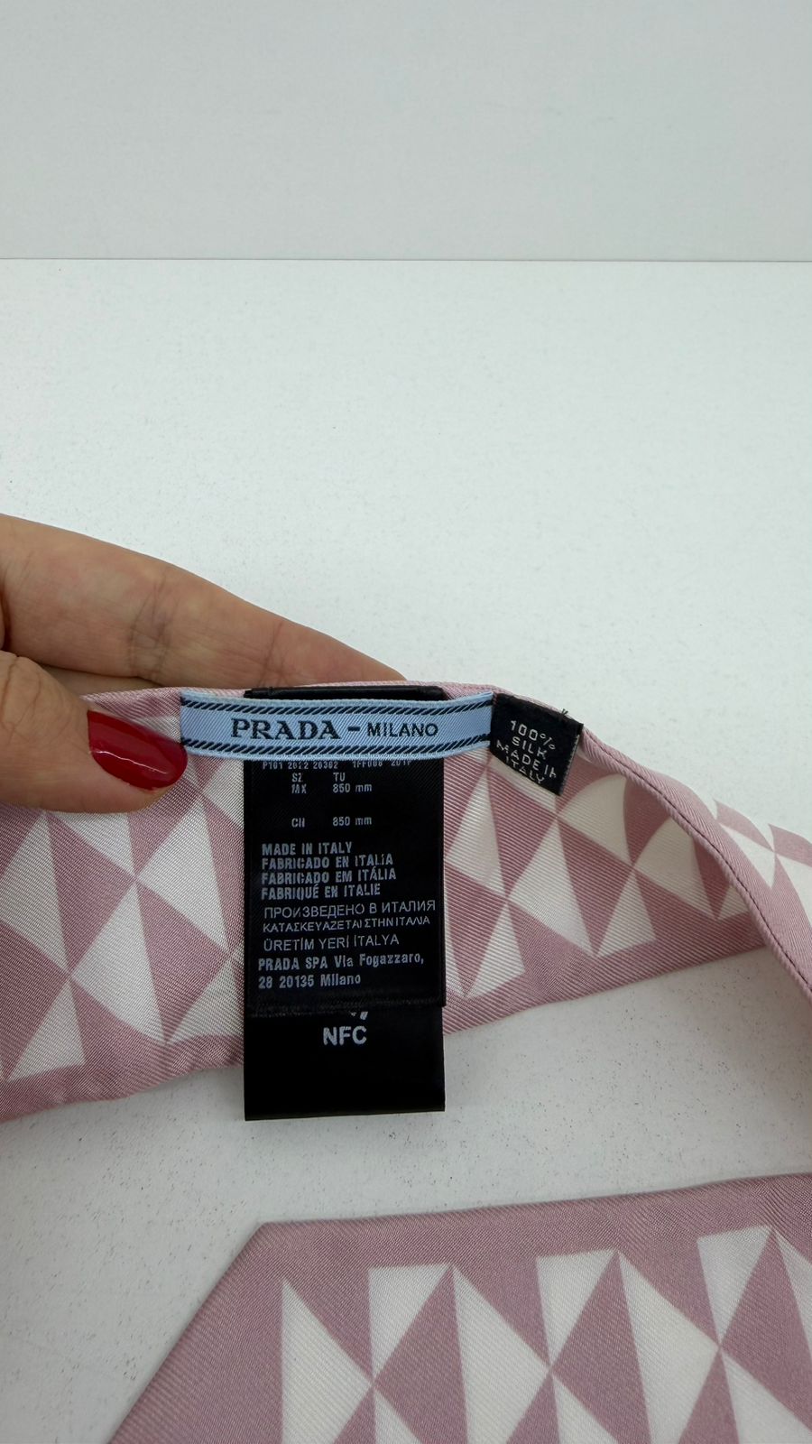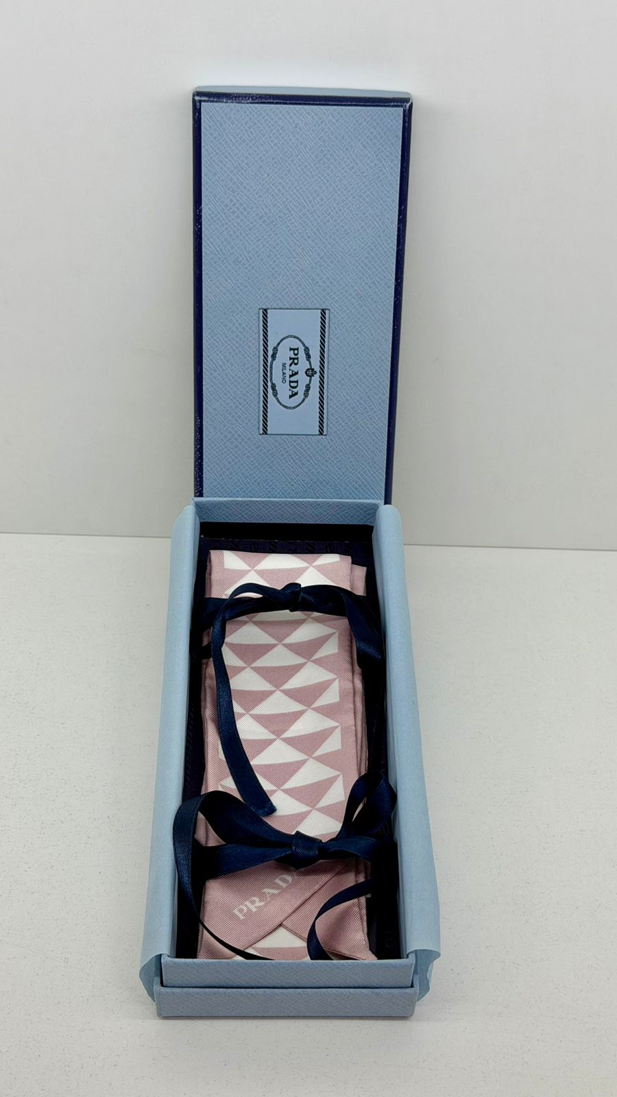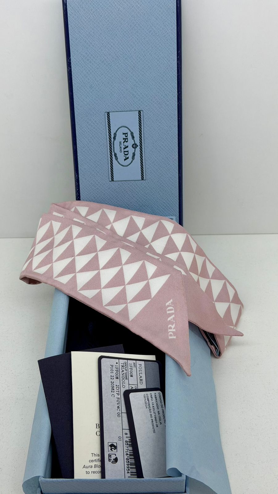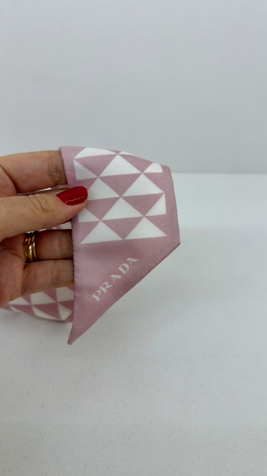 Scarf Prada Twilly , confeccionado em seda, estampa geométrica triangular em tons rosa claro e branco. Versátil, pode ser usado no pescoço, cabelo, pulso ou amarrado à bolsa, adicionando um charme luxuoso ao visual.