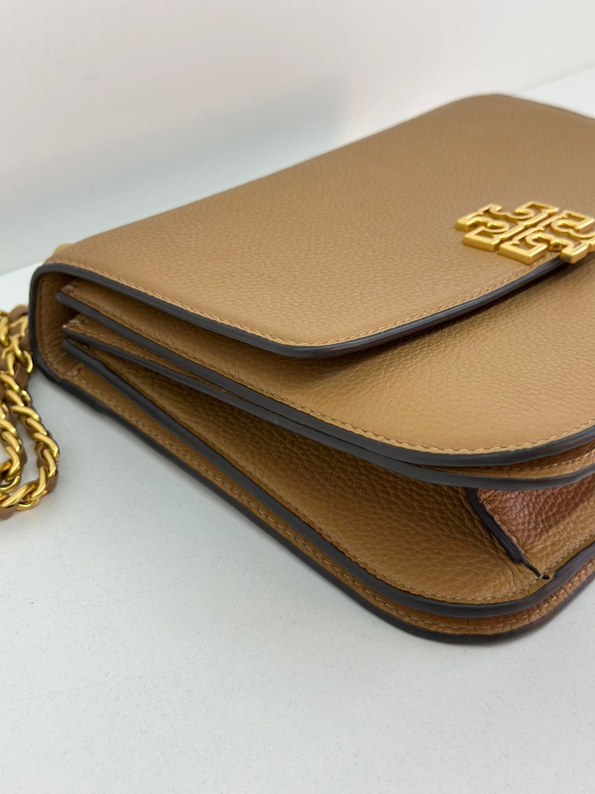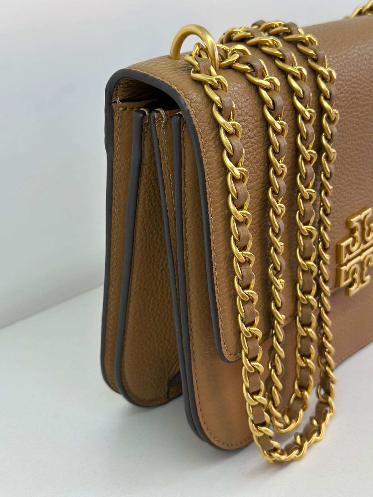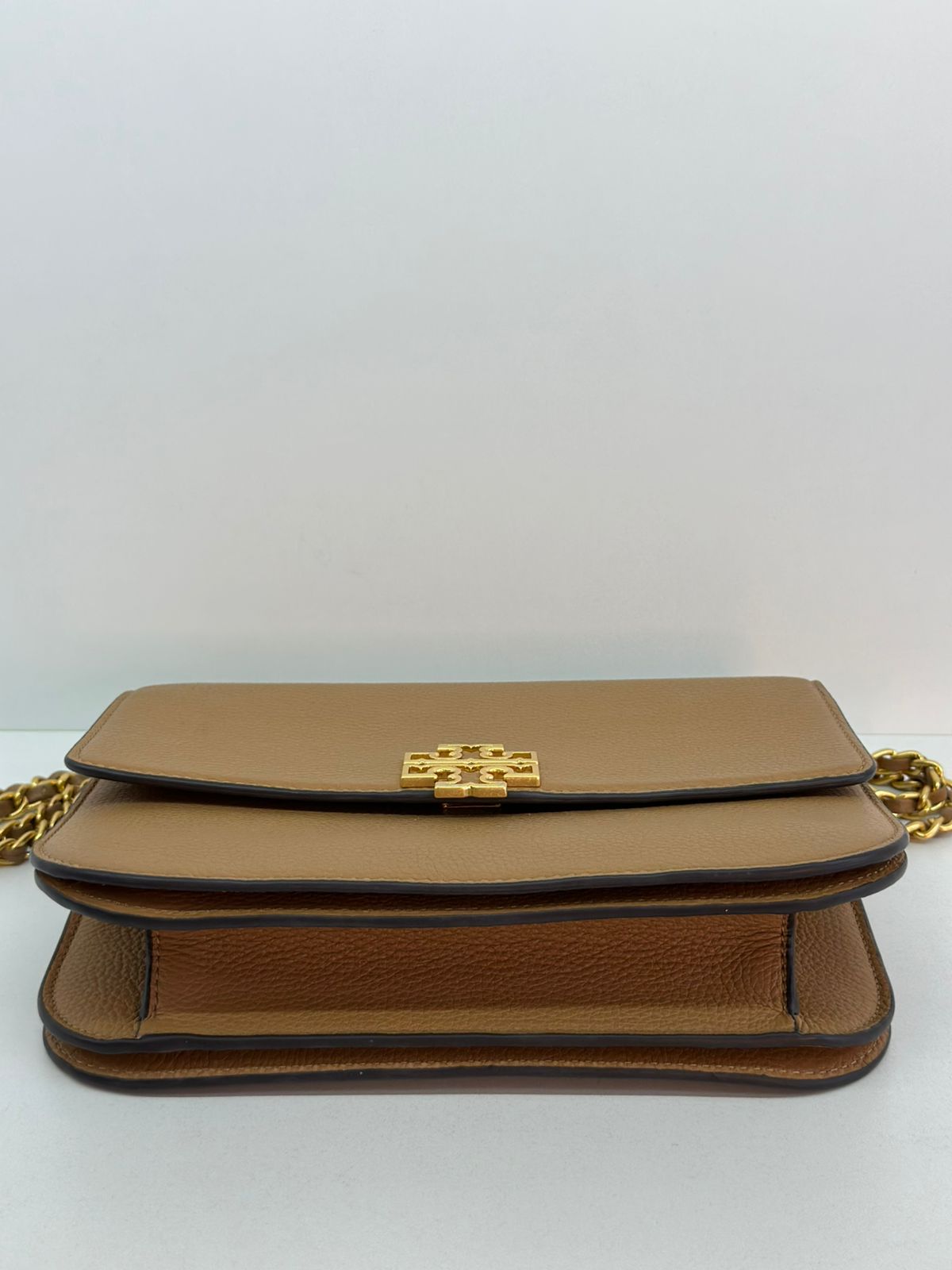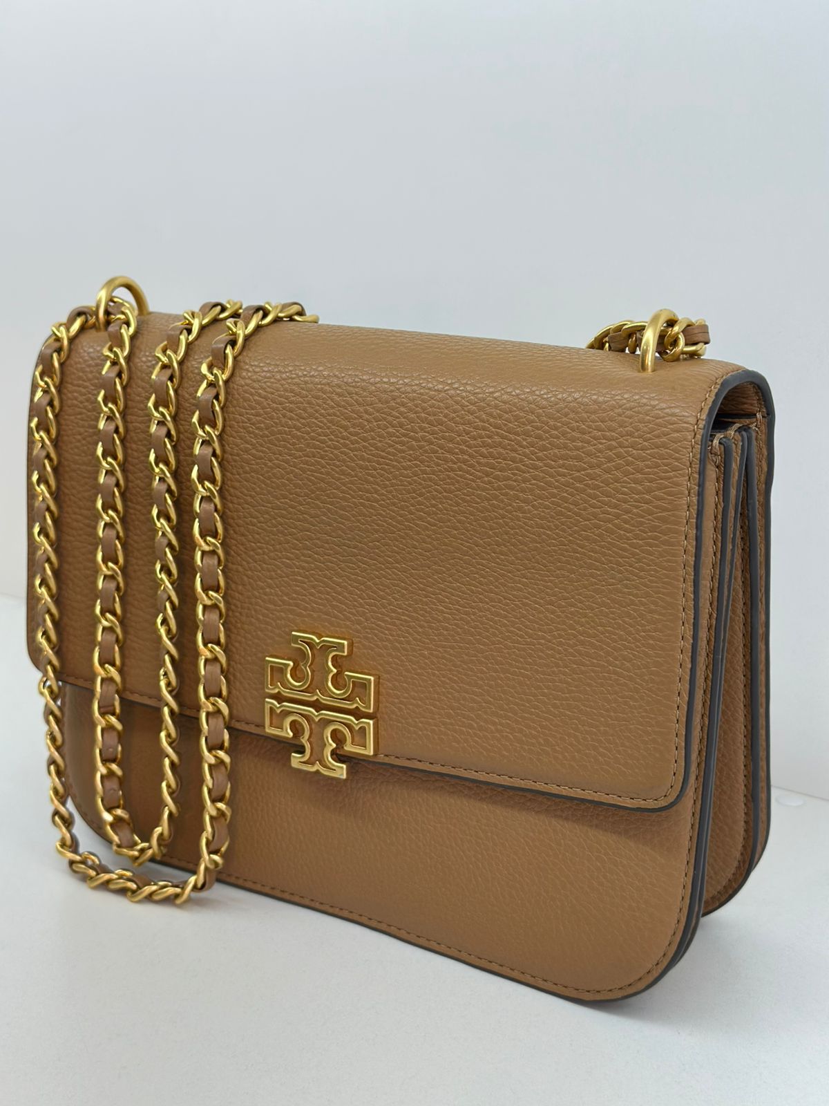 Bolsa Tory Burch Britten Small, confeccionada em couro caramelo, bolsa estruturada, fecho principal por aba flap e botão magnético, ferragens no dourado,  alça longa de ombro em corrente e couro, parte frontal possui o símbolo da marca em metal, parte posterior possui um bolso plano, forro em tecido, compartimento duplo, com um bolso com fecho em zíper. Uma bolsa elegante para o dia a dia, que não ira conseguir passar desapercebida.