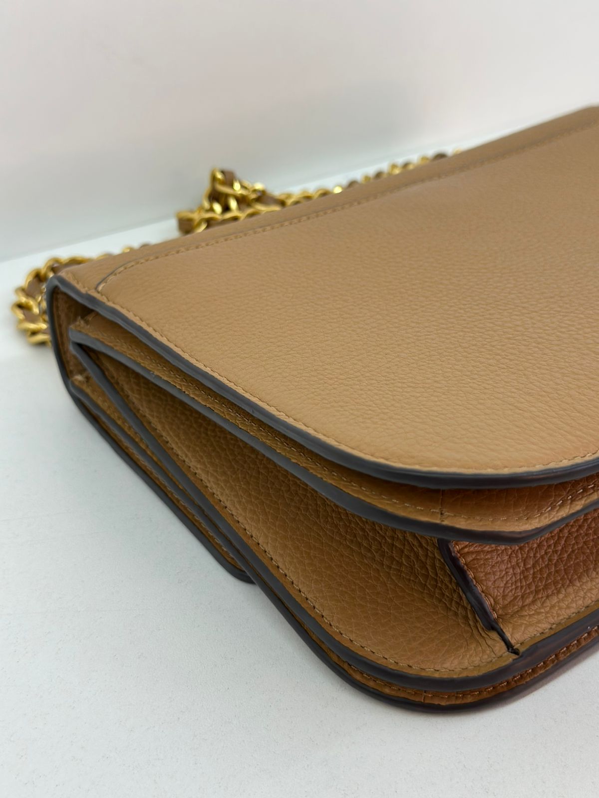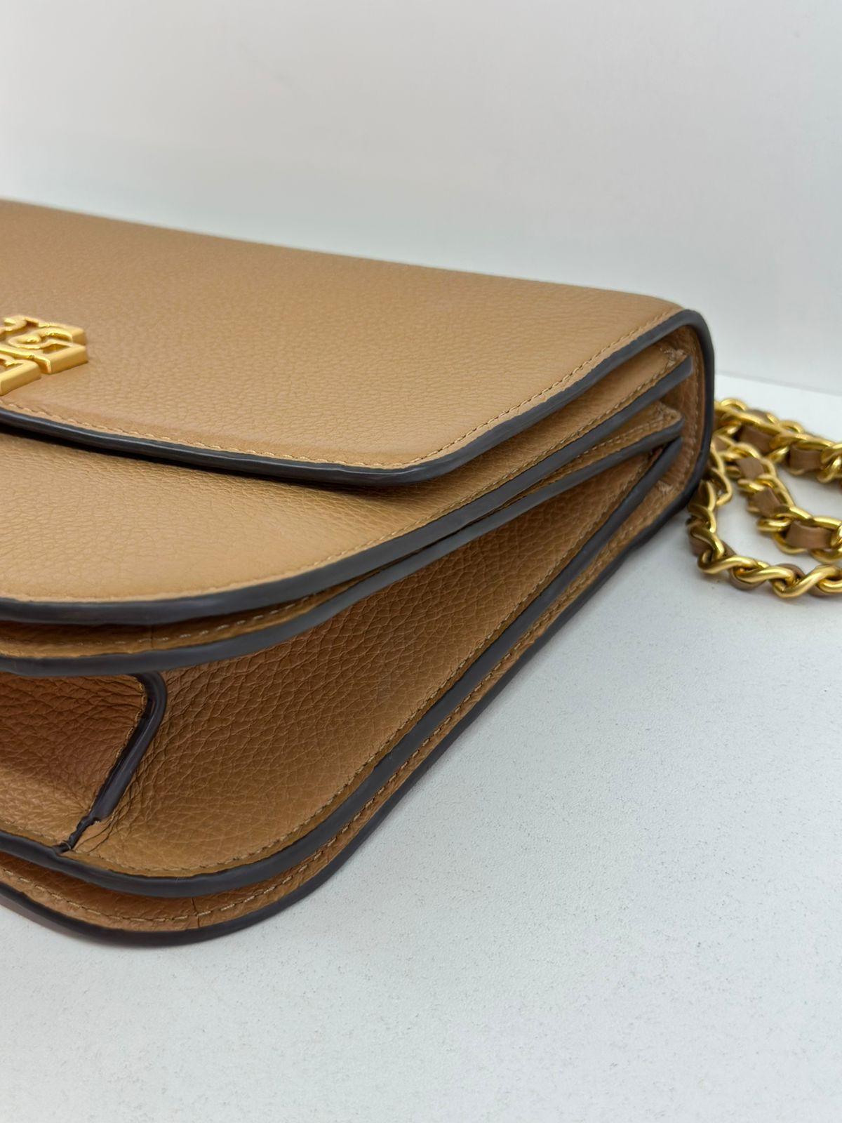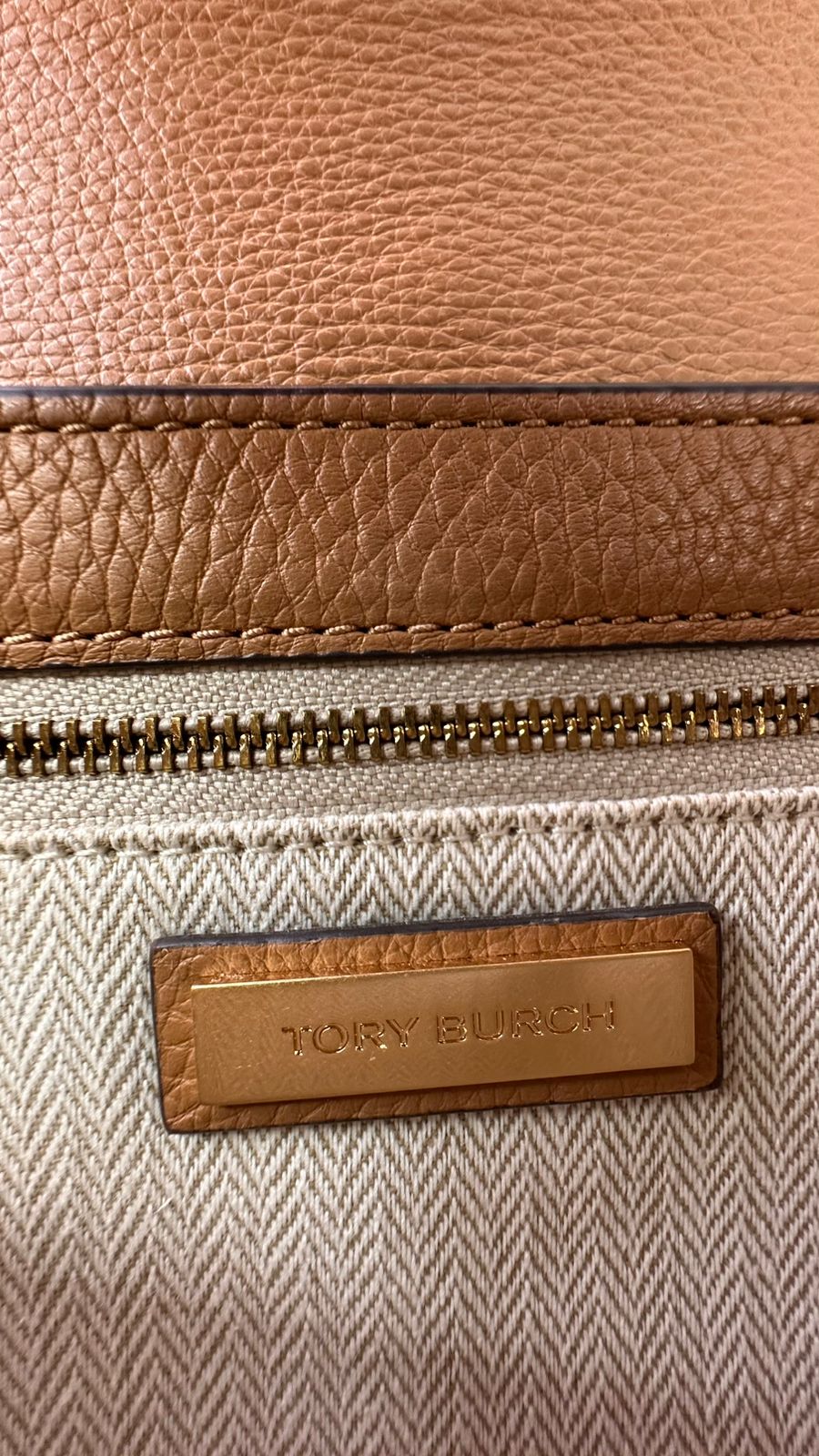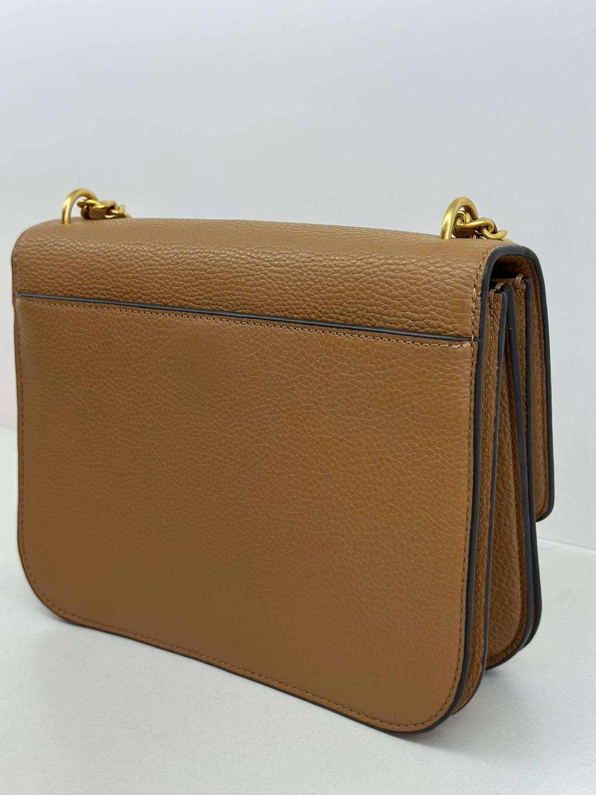 Bolsa Tory Burch Britten Small, confeccionada em couro caramelo, bolsa estruturada, fecho principal por aba flap e botão magnético, ferragens no dourado,  alça longa de ombro em corrente e couro, parte frontal possui o símbolo da marca em metal, parte posterior possui um bolso plano, forro em tecido, compartimento duplo, com um bolso com fecho em zíper. Uma bolsa elegante para o dia a dia, que não ira conseguir passar desapercebida.