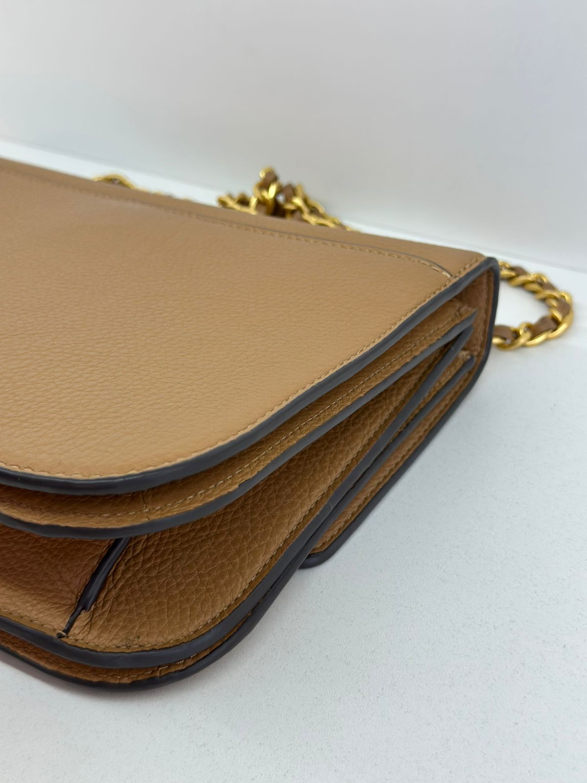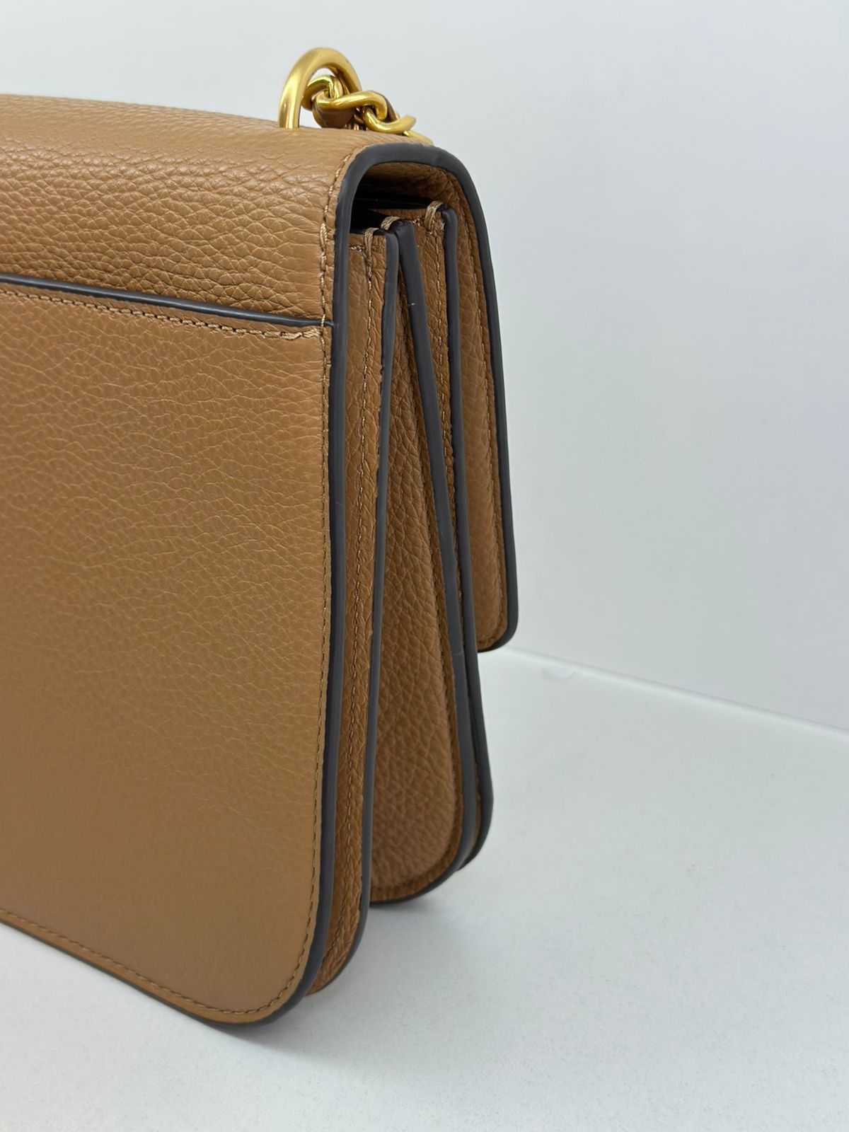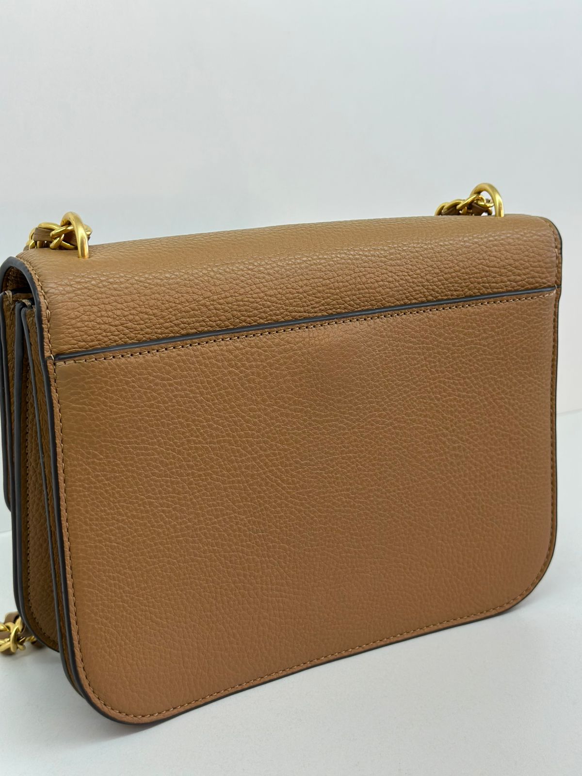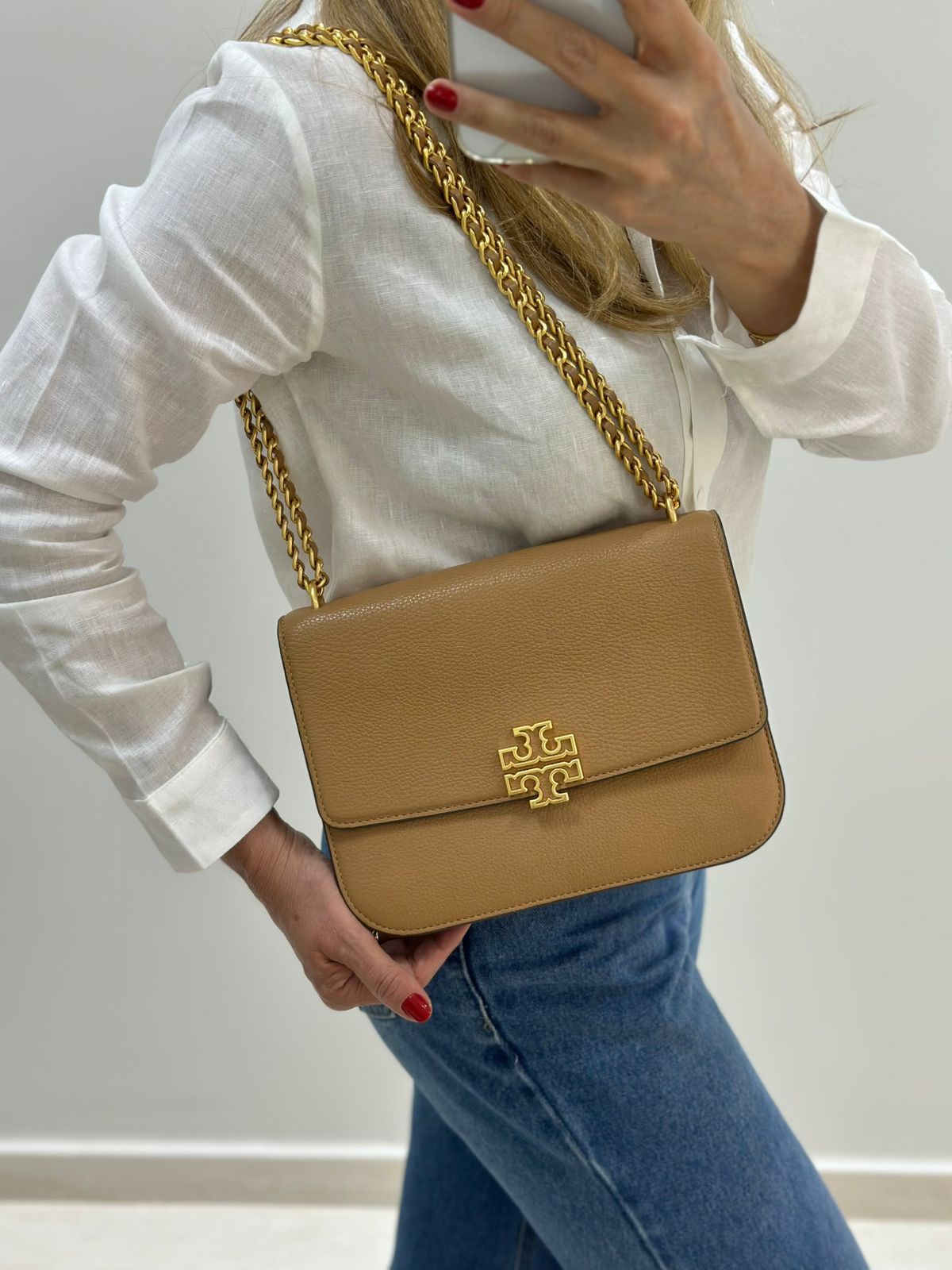 Bolsa Tory Burch Britten Small, confeccionada em couro caramelo, bolsa estruturada, fecho principal por aba flap e botão magnético, ferragens no dourado,  alça longa de ombro em corrente e couro, parte frontal possui o símbolo da marca em metal, parte posterior possui um bolso plano, forro em tecido, compartimento duplo, com um bolso com fecho em zíper. Uma bolsa elegante para o dia a dia, que não ira conseguir passar desapercebida.