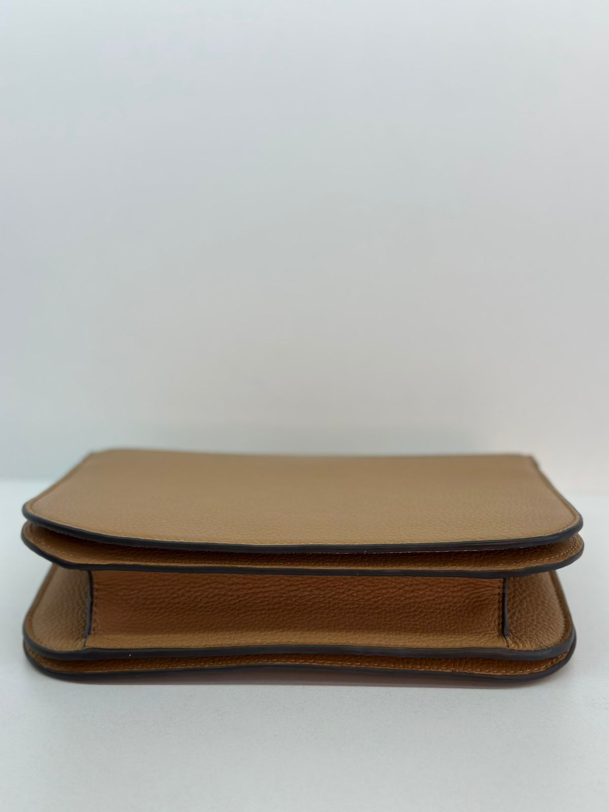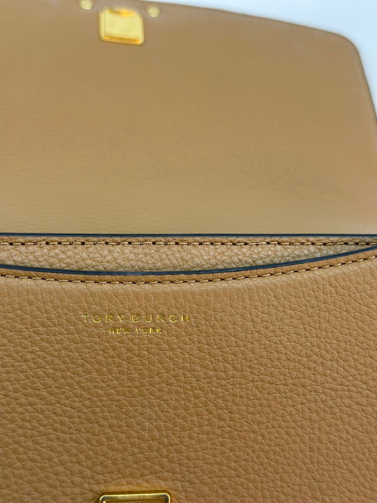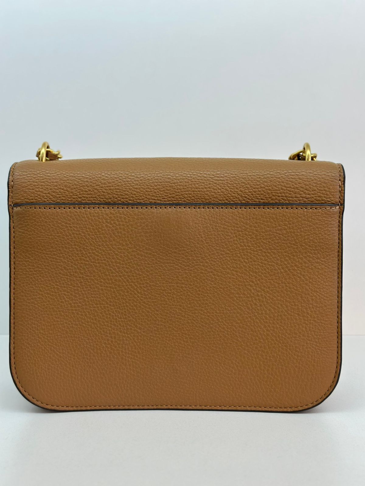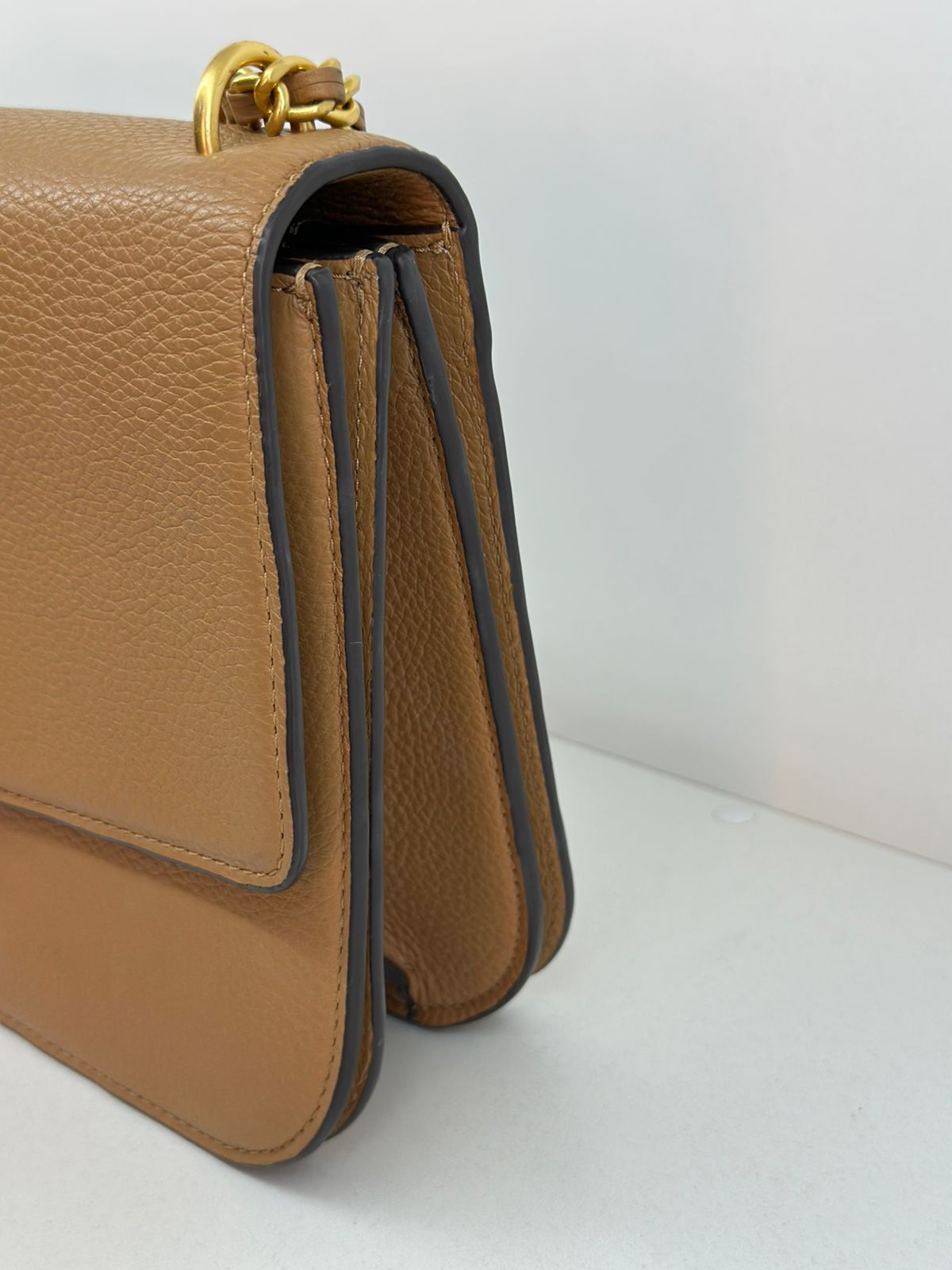 Bolsa Tory Burch Britten Small, confeccionada em couro caramelo, bolsa estruturada, fecho principal por aba flap e botão magnético, ferragens no dourado,  alça longa de ombro em corrente e couro, parte frontal possui o símbolo da marca em metal, parte posterior possui um bolso plano, forro em tecido, compartimento duplo, com um bolso com fecho em zíper. Uma bolsa elegante para o dia a dia, que não ira conseguir passar desapercebida.